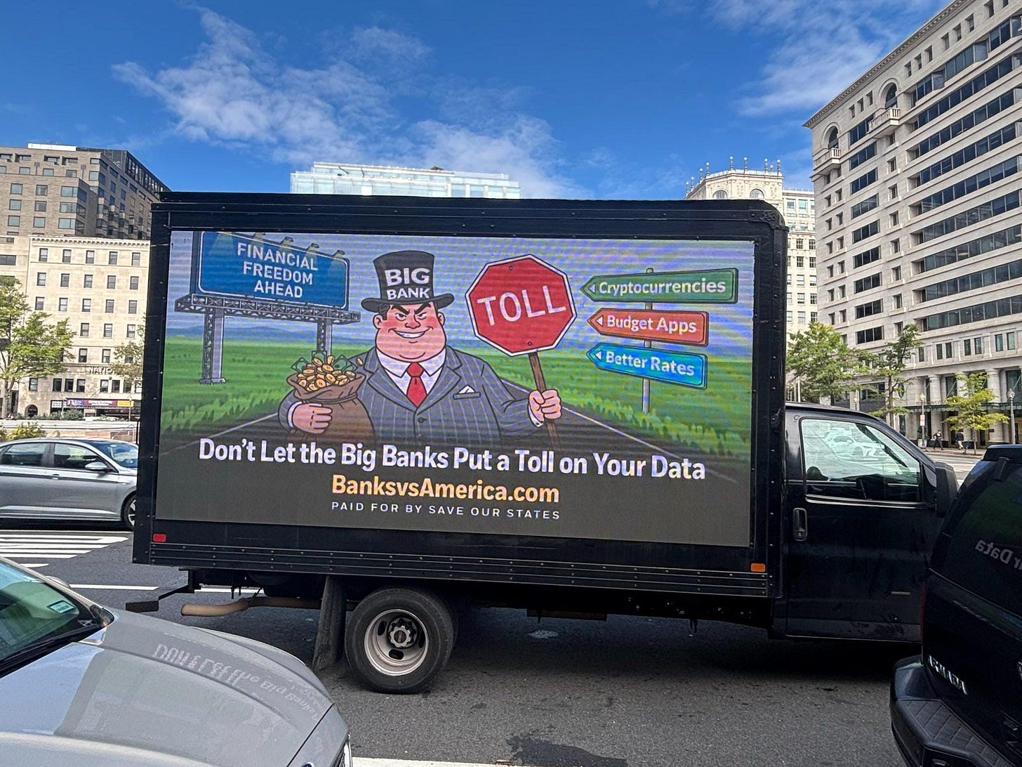 A separate conservative advocacy group, Save Our States, is running a “Banks vs. America” campaign warning of “tolls” on data that could affect “cryptocurrencies” as well as “budget apps.” It recently sent a billboard truck featuring a cartoon of a greedy banker with a bag of gold coins to drive through downtown Washington.